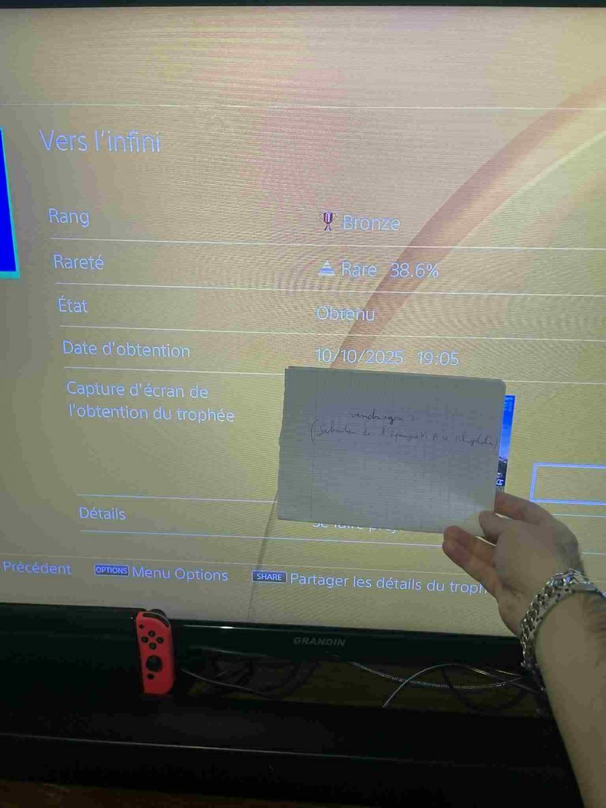 - Prenez une photo du trophée sur l'écran de votre console prouvant l'accomplissement du trophée, accompagnée de votre pseudo WAP manuscrit et votre PSN ID visibles et écrits à la main sur un papier à côté
