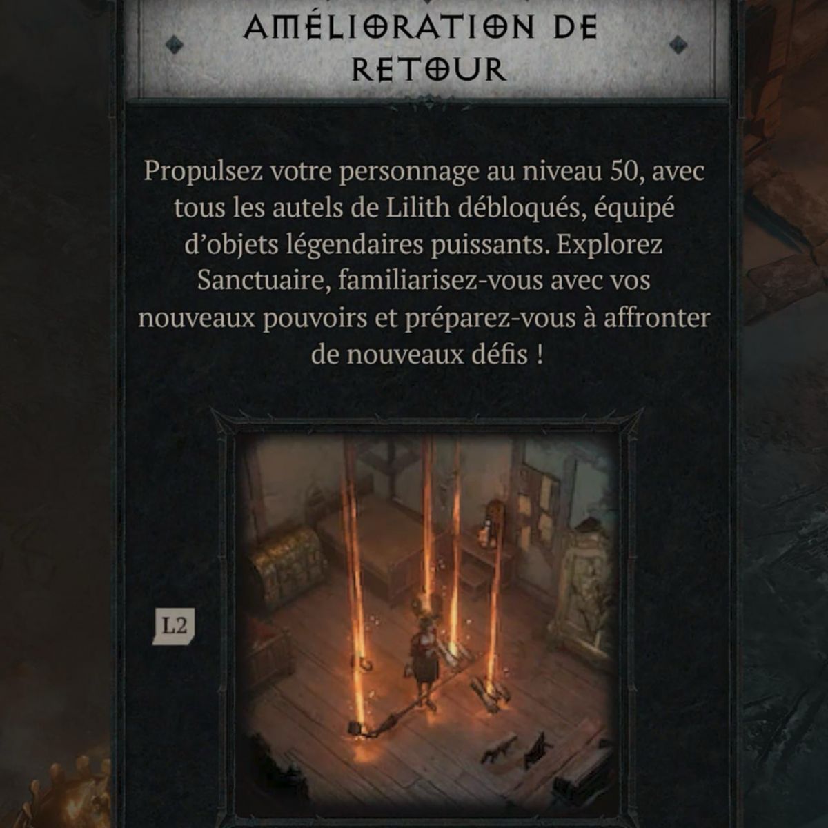 Ensuite je captes que pour récompenser de mon retour je peux aller à la taverne et hop mon barbare est propulsé direct de level 23 à level 50 avec nouveau stuff Légendaire et hop trois trophées en 5 mn