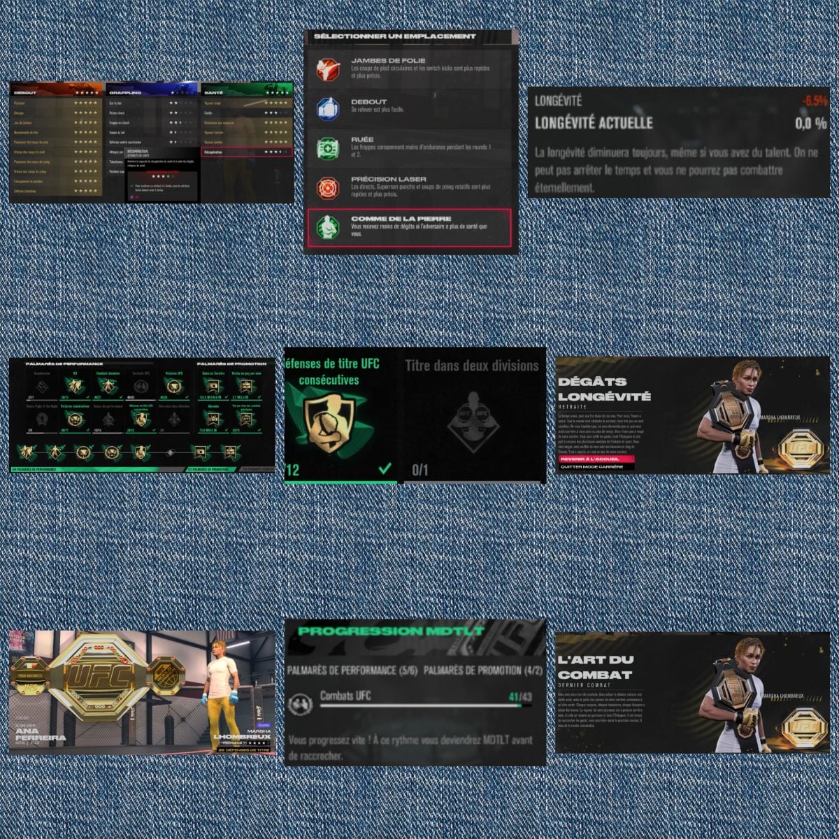 Ne me manquait que deux combats d’UFC or , sans quasi prendre de coups, alors que je perdais 1,5 % de longévité par match, les quatres derniers matchs gagnés en quelques secondes, j’ai perdu 3,5%, 3,8%, 4,5%puis carrement 6,5% pour ne pas pouvoir jouer deux derniers matchs qui m’auraient vallu le titre de MDTLT
