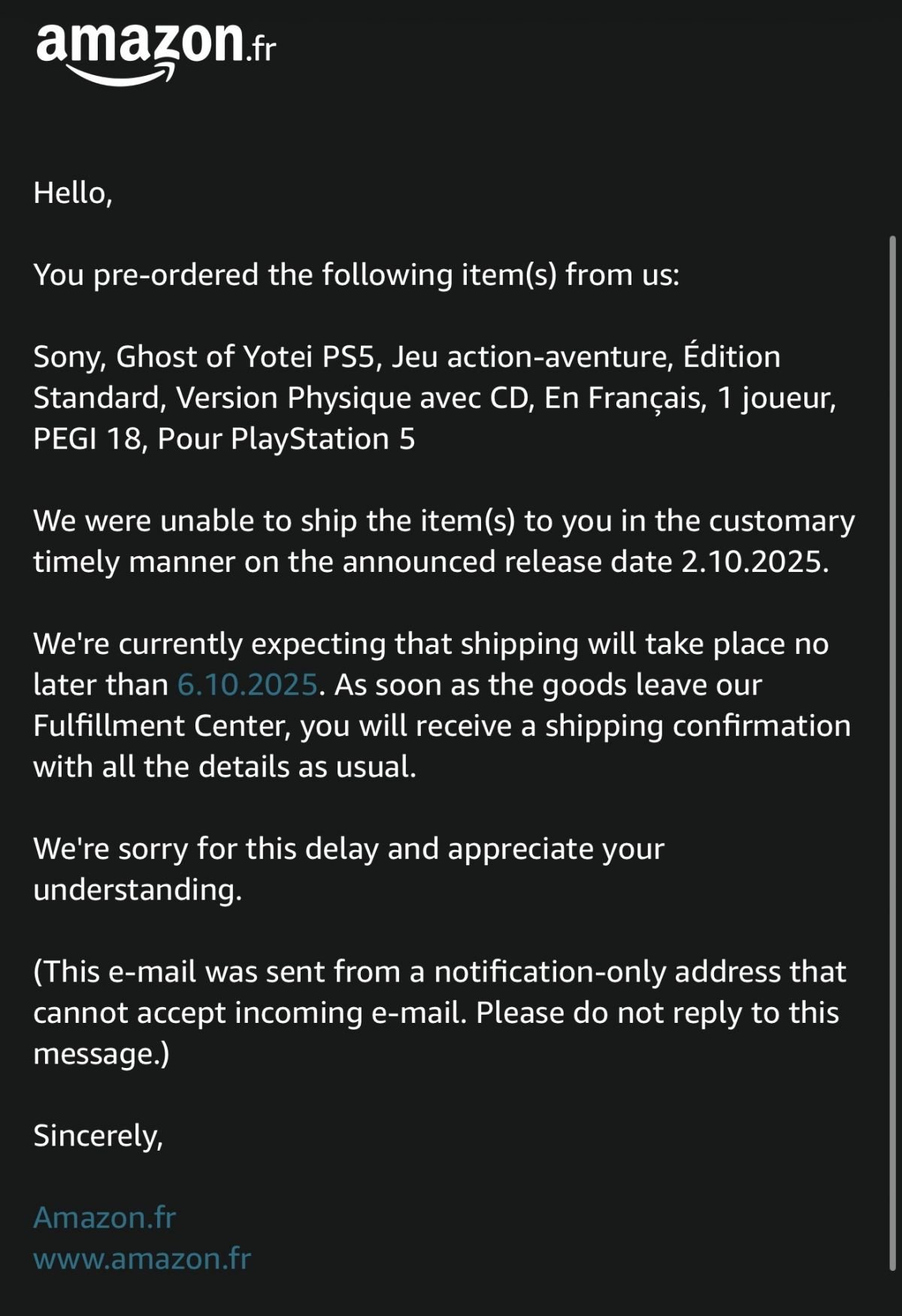 Ce message d Amazon j’ai cru a un fake comme le mail est en anglais mais nan c’est bien réel.