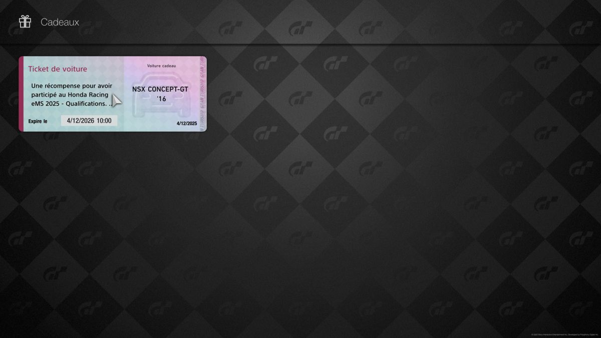 Dans ma publication je rajoute que j’ai participé au Honda Racing EMS 2025, qualifications en ligne et j’ai remporté la Honda NSX Concept de 2016 avec mon chrono en argent ! le niveau or était intouchable pour moi.