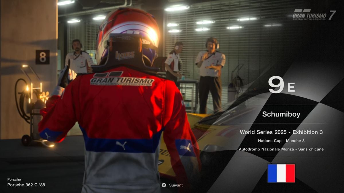 Au freinage de la chicane, un pilote arrive pleine balle à gauche et freine tellement tard qu’il emmène tout le monde hors piste ! C’est du grand n’importe quoi. Il est français, nous sommes en Nations Cup, et il fait cette manœuvre sur nous ? Bref, je continue et je me retrouve en 8e position. Plus loin, le 7e (avec qui je vais avoir beaucoup de souci) freine très fort alors qu’à cet endroit ça passe tranquille. Je le percute sans faire exprès et j’abîme ma voiture alors qu’elle l’est déjà depuis l’accident à la chicane. Je perds des places et je me retrouve en 10e position. Elle clignote rouge devant et derrière et ce n’est pas agréable. A « Ascari », je prends la bordure un peu trop à la limite et je prends 0’’5 de pénalité.