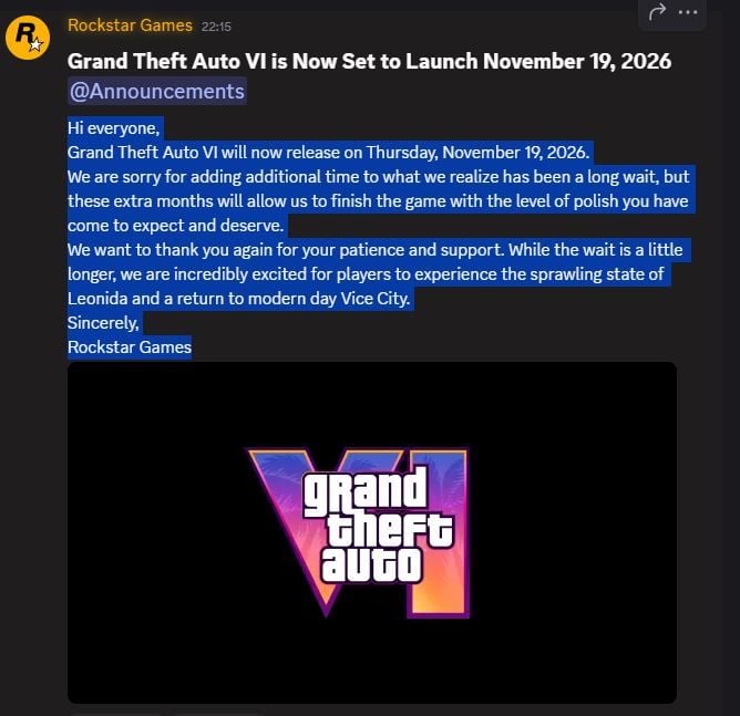 C'est via Discord, à l'instant, que Rockstar vient d'annoncer le report du jeu :