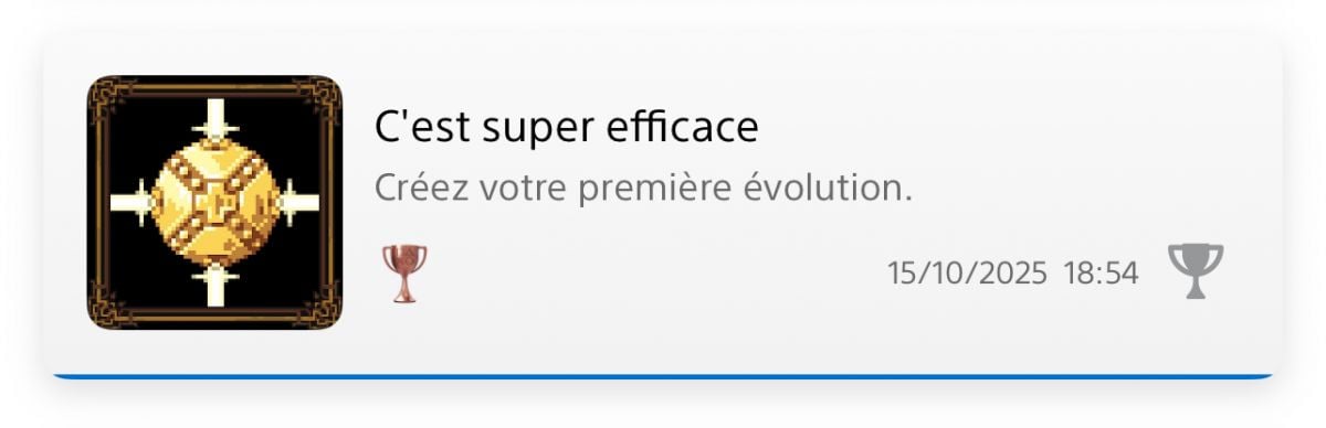 Note : le nom du trophée est un easter egg, que vous aurez probablement identifié facilement. Il s’agit d’une référence aux jeux vidéo Pokemon. C’est super efficace est le commentaire qui apparaît quand un pokémon utilise une attaque qui touche une faiblesse du pokemon adverse.