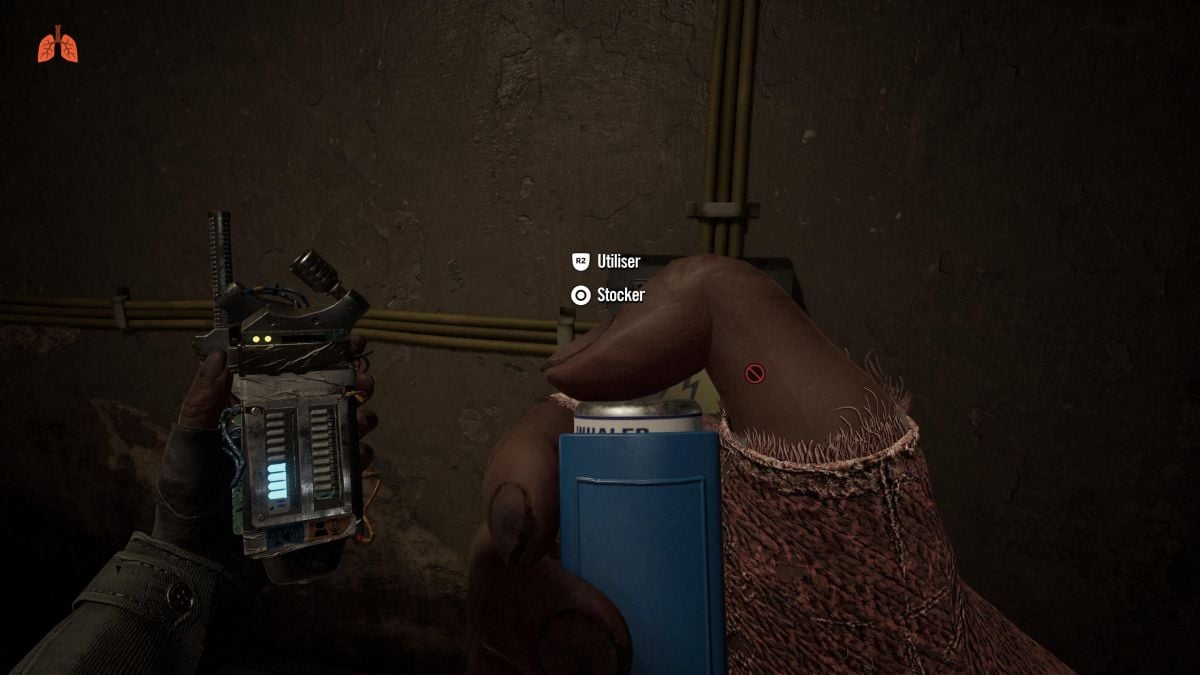 Les zones où il y a de la poussière, les flaques d'eau, les bris de verre au sol ne faciliteront pas la tâche au cours de notre périple. Mais pour nous y aider, nous aurons des indications qui s'afficheront pour nous guider un peu plus facilement. Par exemple, dans l'ATH, en haut à gauche de l'écran, nous avons un poumon qui représente notre santé avec trois niveaux de couleur associé qui va du blanc au rouge. Pour éviter que notre personnage tousse à ce moment-là, nous devons au préalable avoir sur nous des inhalateurs. Mais attention les ressources sont rares!