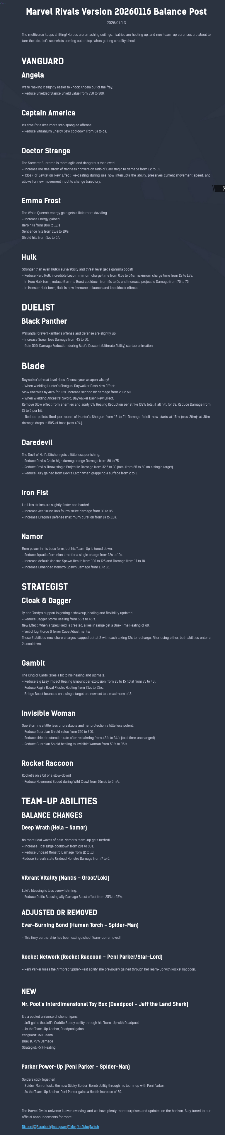 Côté Duelistes, Black Panther, Blade, Daredevil, Iron Fist et Namor recoivent des ajustements.
