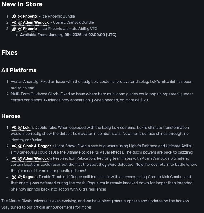 Il y a aussi différents correctifs sur Loki, Cloak & Dagger, Adam Warlock et Rogue.
