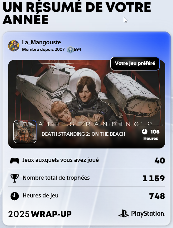 Comme attendu, le jeu sur lequel j'ai passé le plus d'heures est Death Stranding 2 On the Beach (dont j'ai obtenu le platine). Par contre, je suis étonné sur le nombre d'heures de jeu total, peut-être ai-je laissé ma console en pause trop longtemps certaines fois.