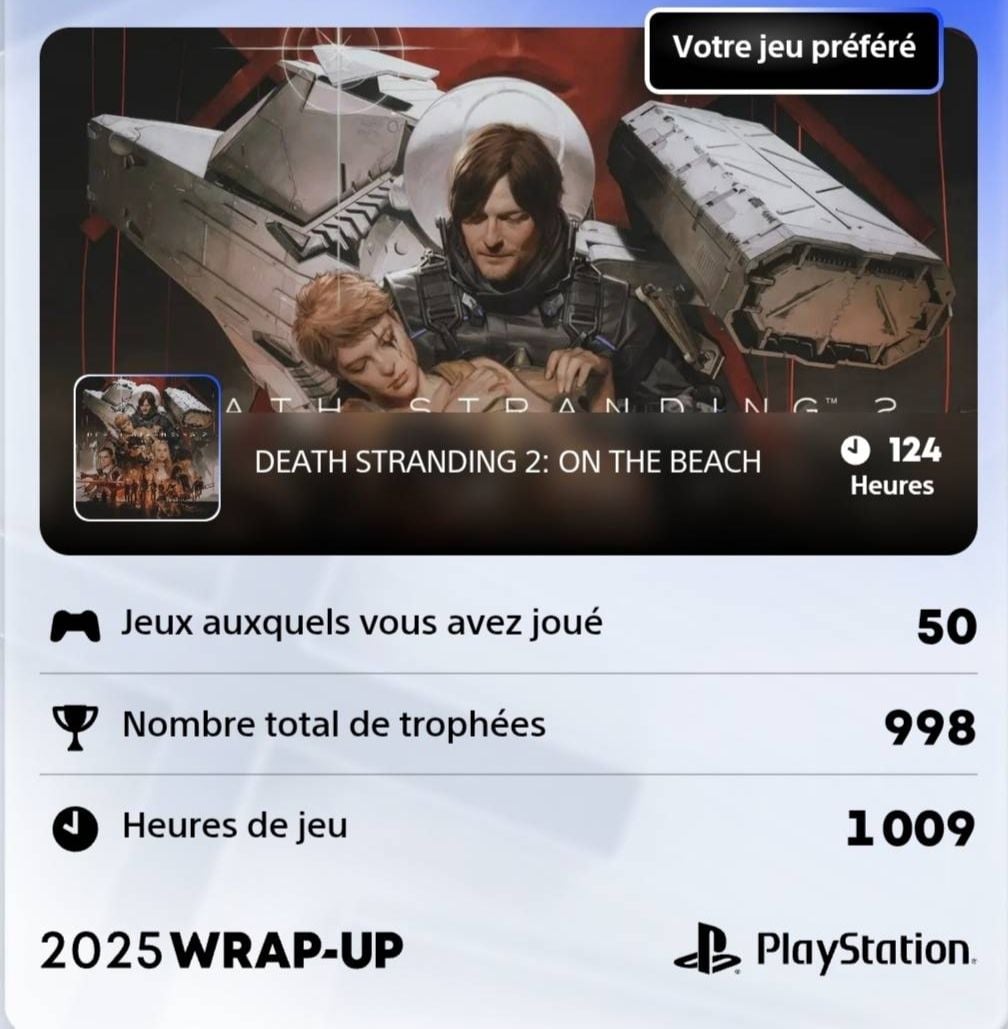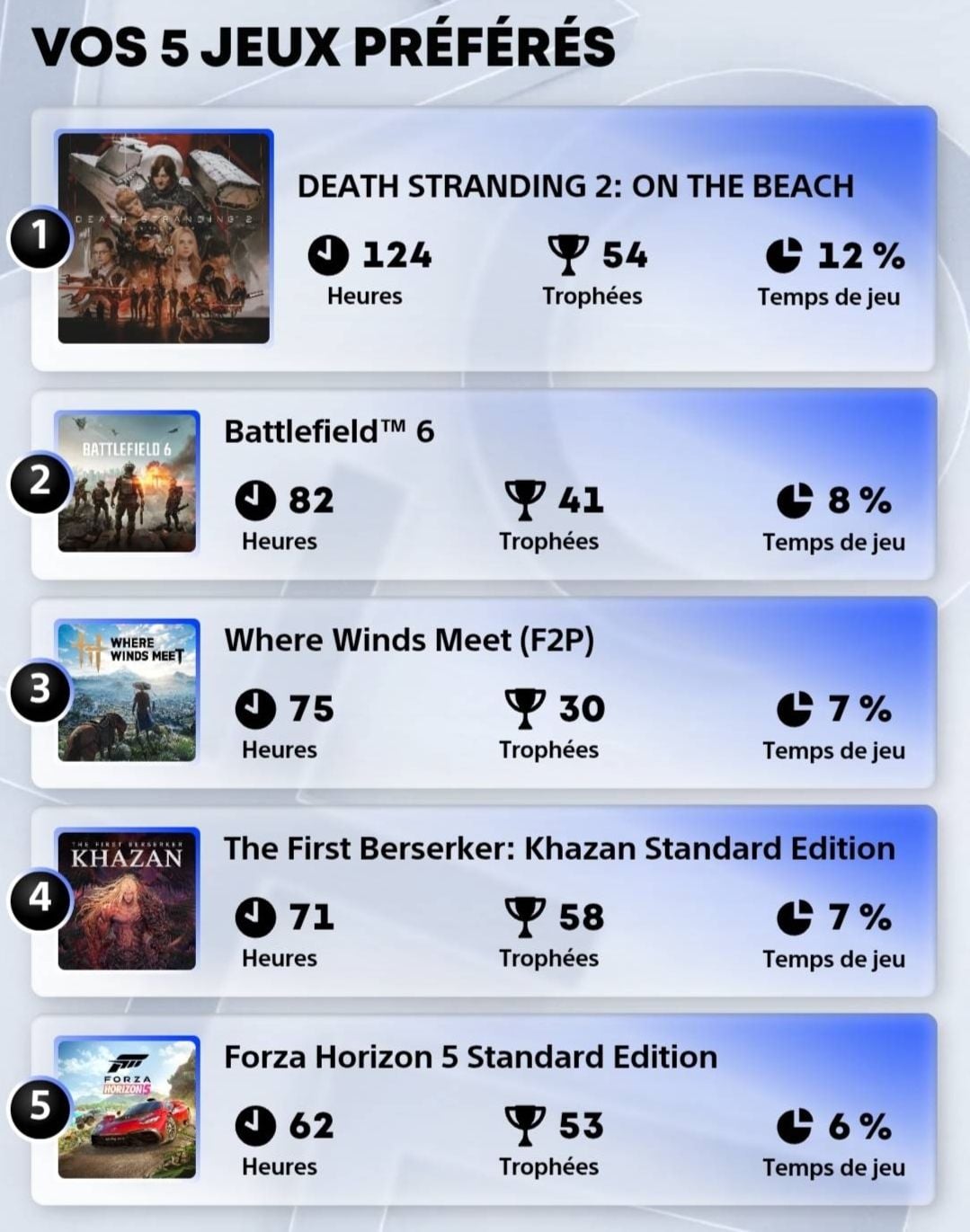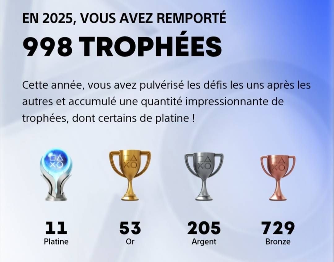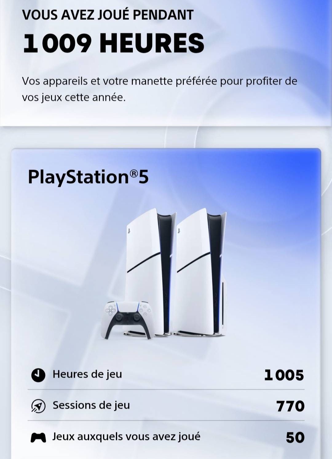 Le récapitulatif de votre année sur Playstation concernant vos nombre d'heures, vos trophées, le nombre de jeux, le top 5, ps+, plateforme...