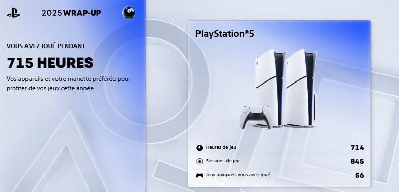 715h , c'est bien moins que l'an dernier de mémoire; même si çà me parait énorme, c'est presque 2h par jour, alors qu'en vrai j'ai des semaines entière sans jouer ... .il doit y avoir des lutins chez moi ^^