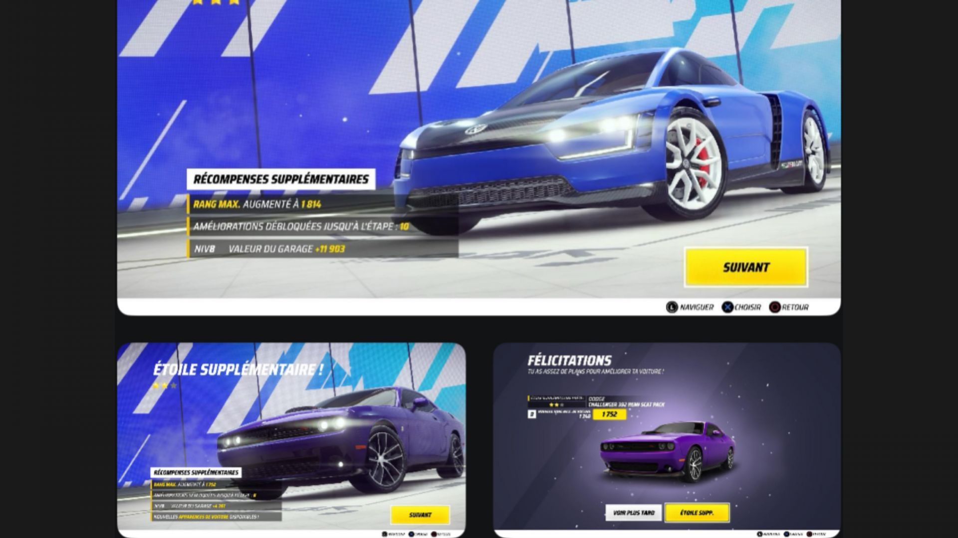 Deux d’entre eux concernent les voitures, en débloquer 30 et rajouter des étoiles à trente d’entre elles, j’en débloques désormais plusieurs par jour et en améliore aussi plusieurs par jour