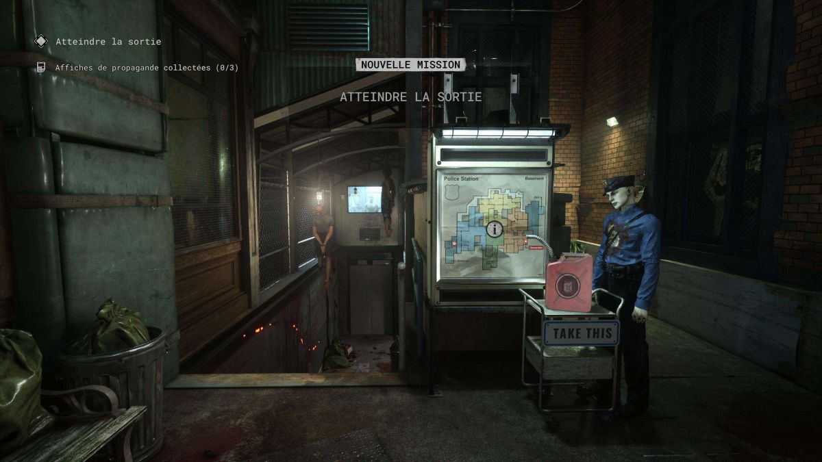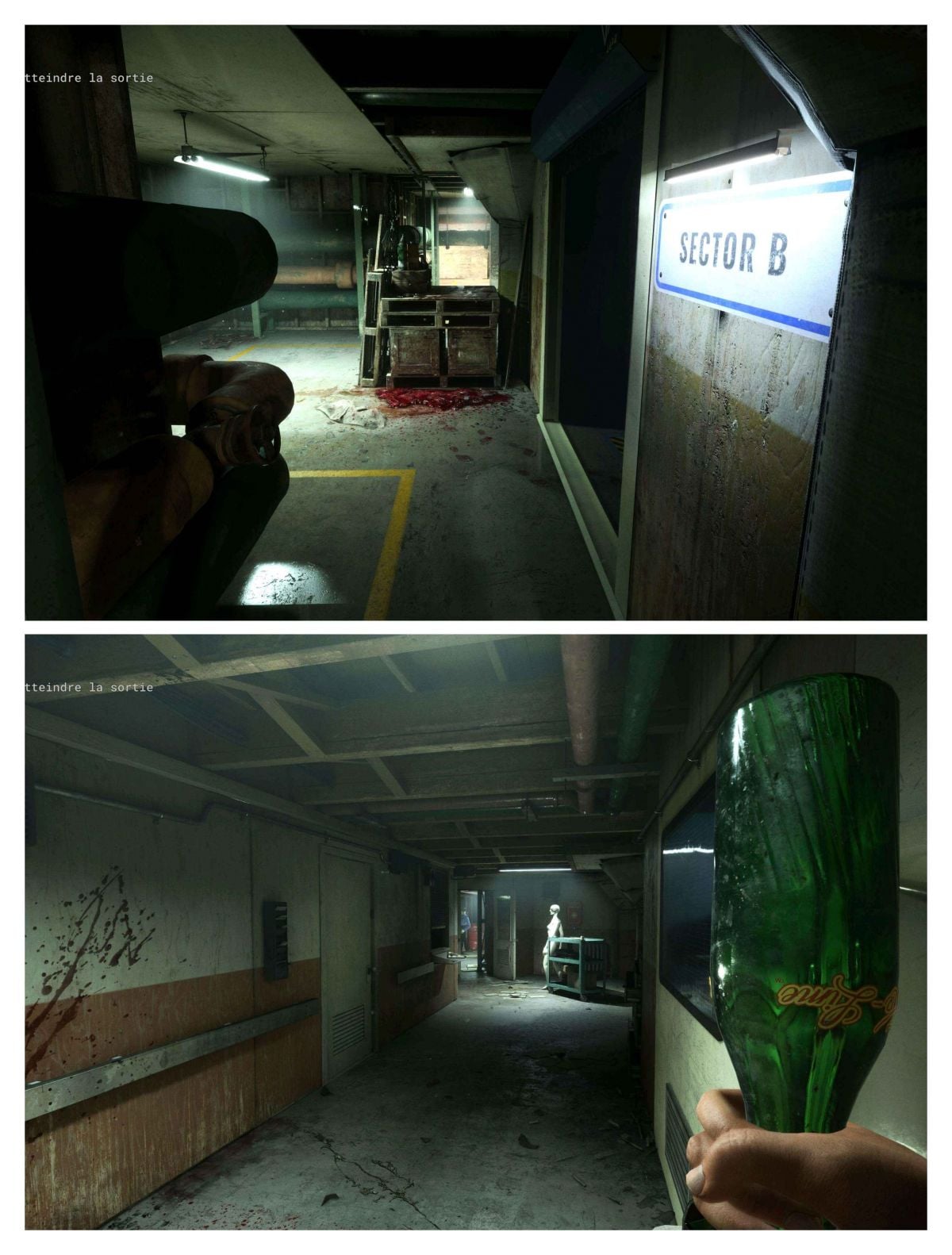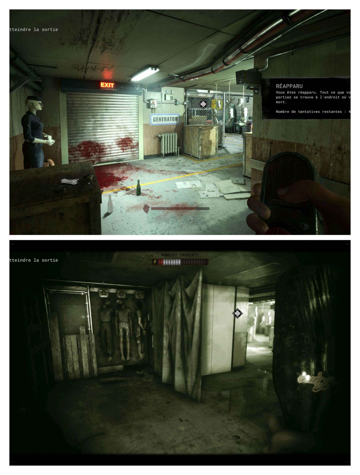 Pour le solo avancer jusqu'à la fin du couloir il y aura le rideau métallique soulever le puis tout droits vous aurez la pièce avec les corps suspendus là où il y aura l'ennemi cachez-vous pour qu'il puisse circuler dans le cas contraire avancer (en duo on sera juste à côté avec le canapé) on se retrouve à la même sortie pour aller au générateur