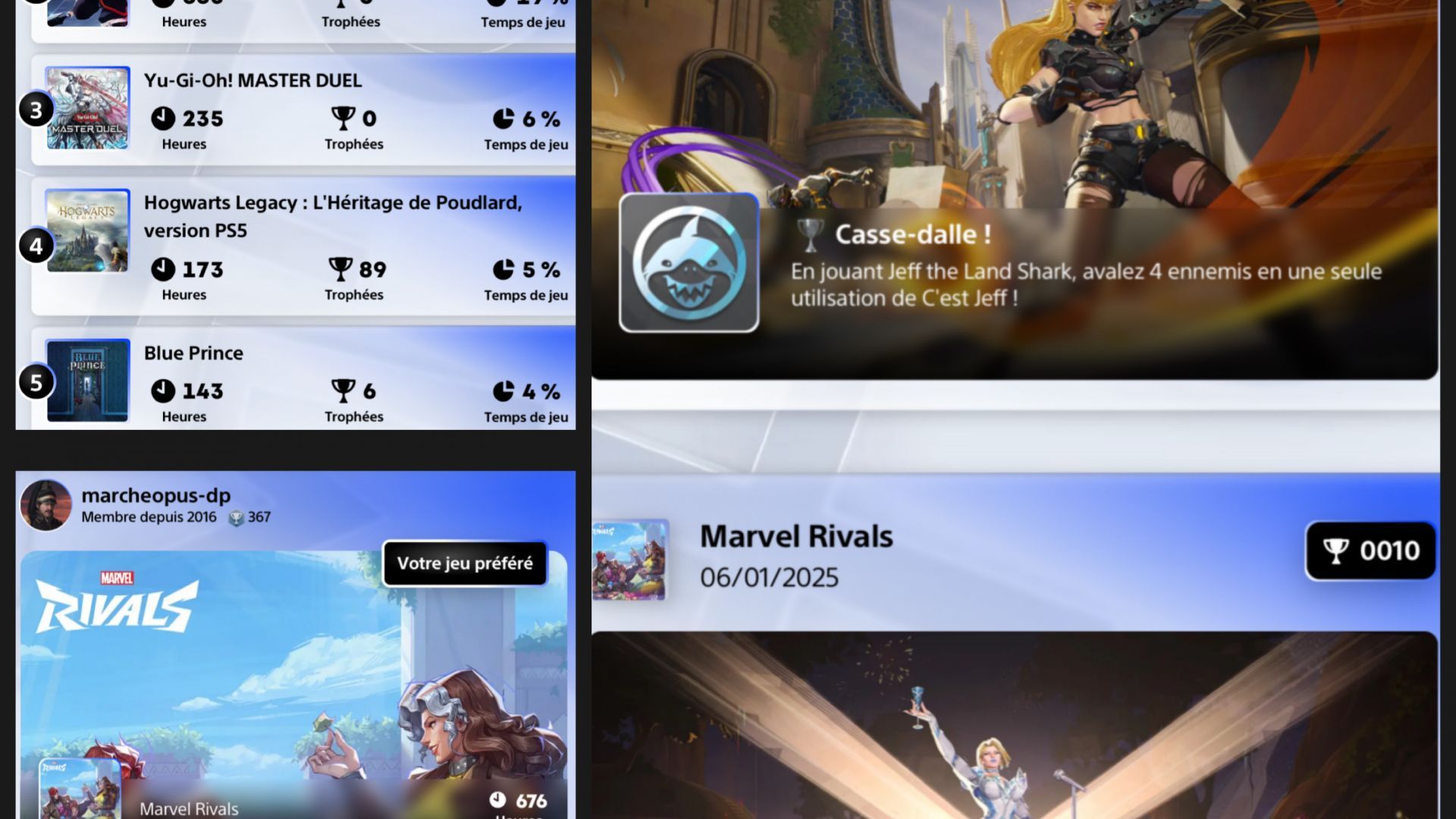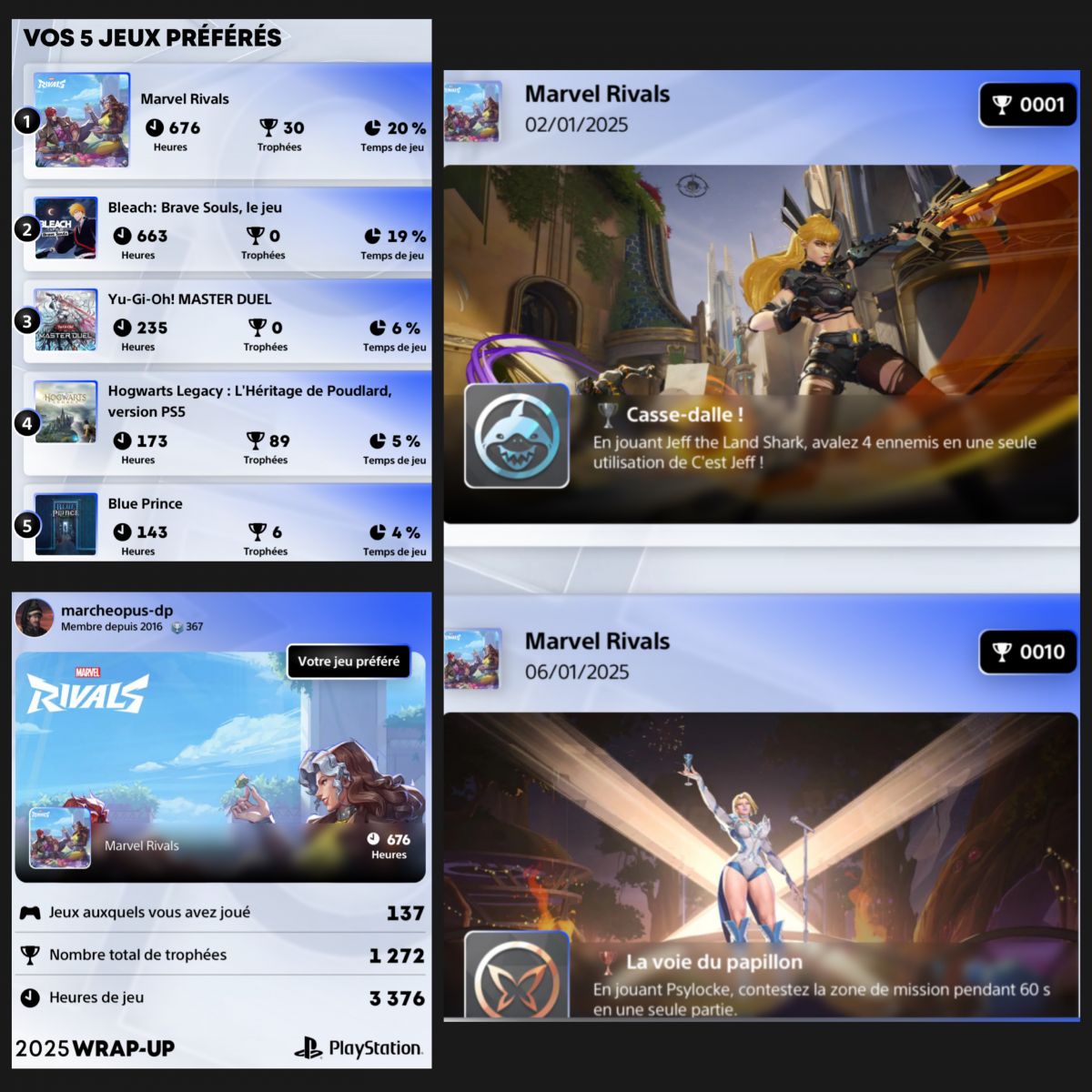 Élaireur day one sur Marvel rivals je fus rapidement dépassé par Sébosaure et Natsuko qui l’ont même platiné avant moi mais replatiné version PS4 en gin d’année après moi par contre car toujours a fond dessus j’étais plus vigilant