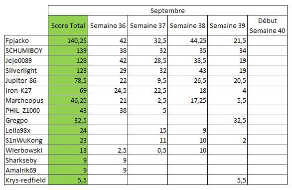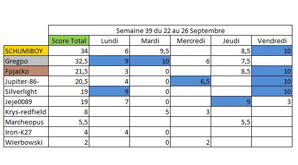 Actuellement @fpjacko reste en tête suivi de très très prêt par @SCHUMIBOY qui a fini en première place cette semaine.