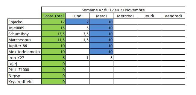 Tableau des scores :