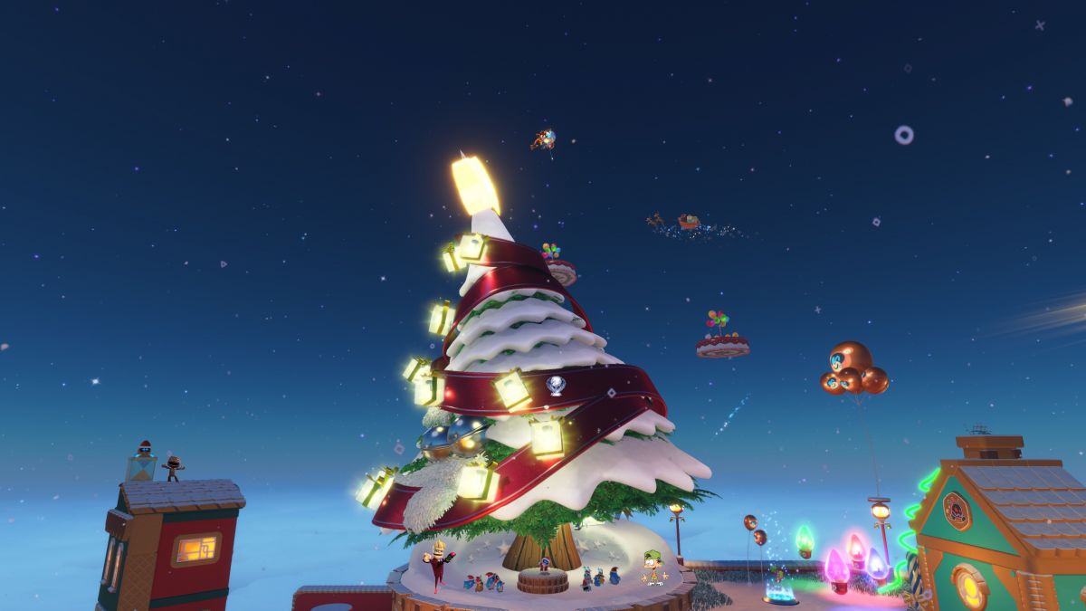Kid Padlle en pleine discution avec trois lapinous en bas à droite au pied du Sapin