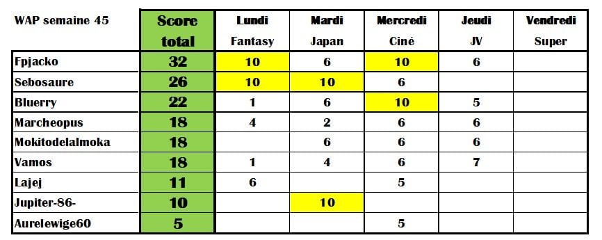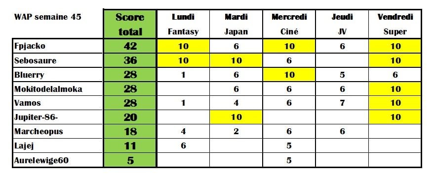 Les scores finaux de la semaine