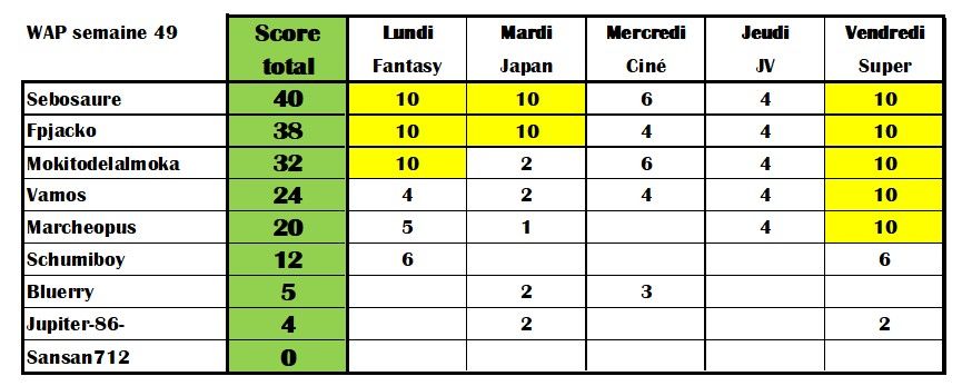 Bravo à vous tous... Je remarque encore une fois que votre point faible sur la semaine c'est les jeux vidéo !!! ☺