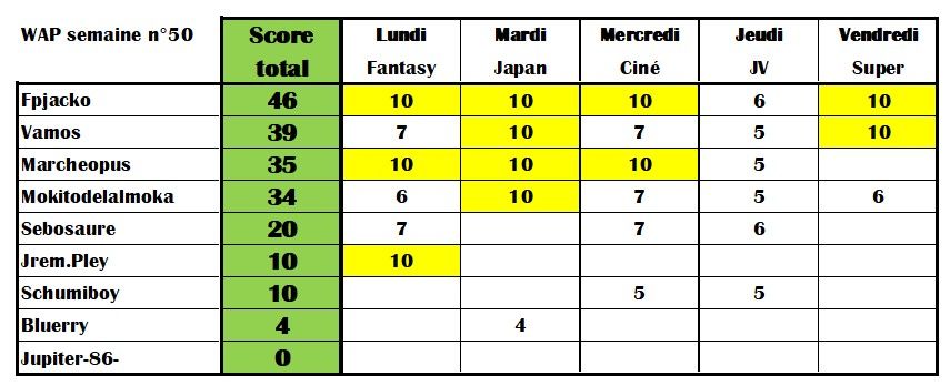 Bravo à lui un joli score pour la première place de la semaine, suivi de Vamos et Marchéopus