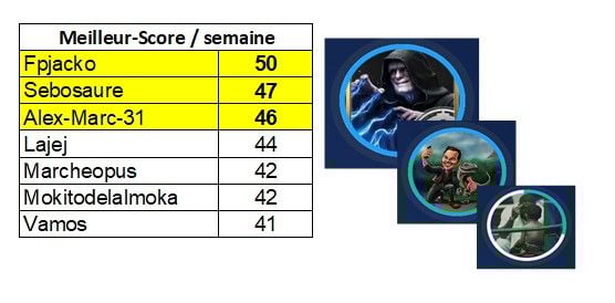 Les meilleurs scores à la semaine (50 étant le score max (4 fois 10 points), réussi 2 fois par Fpjacko)