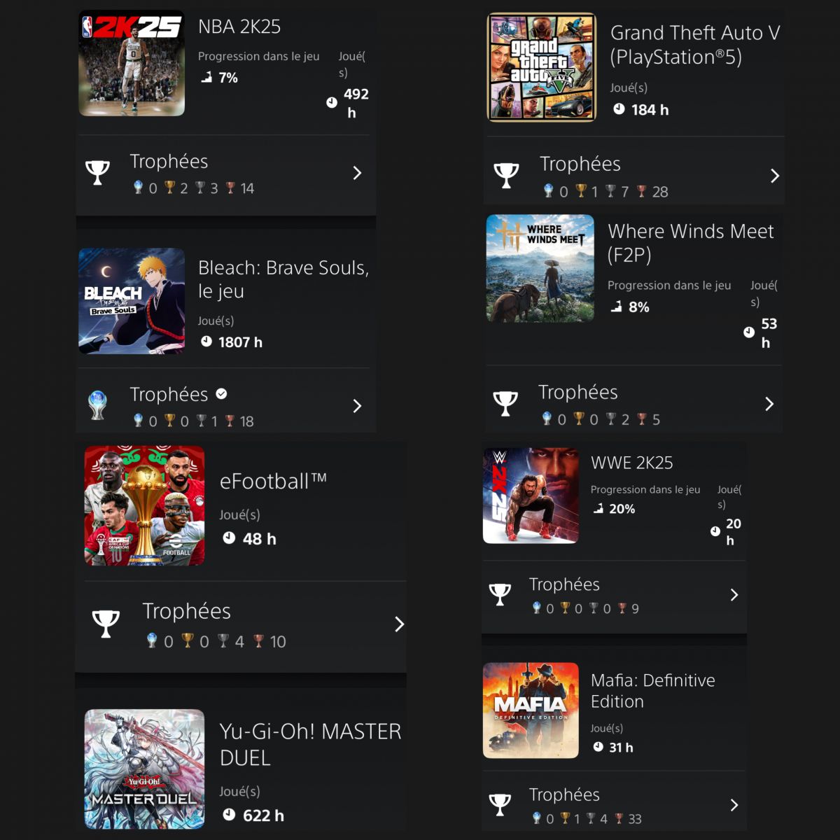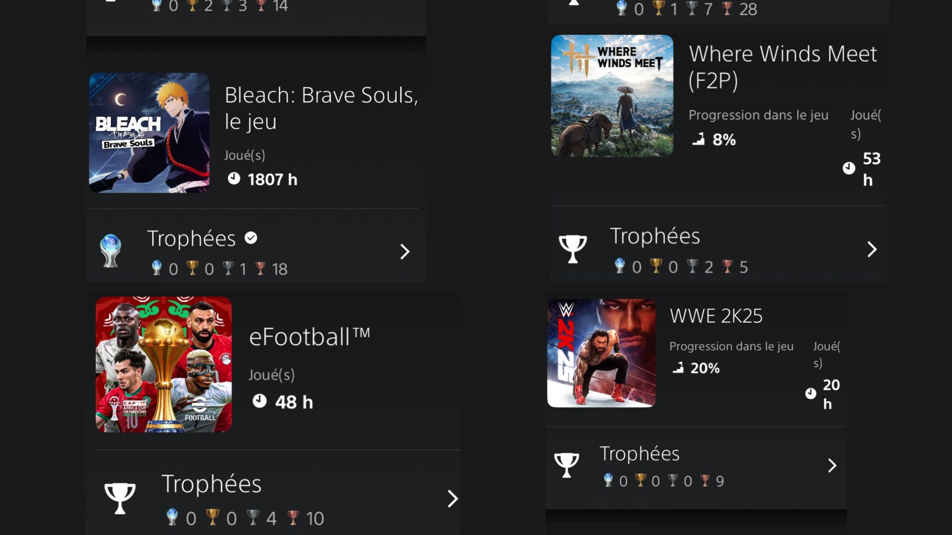 Ajoutons à cela UFC , platiné , e Footbal quasi manque trois trophées, nba 2k25 pas d’autre trophée en vue Wrc deux ou trois