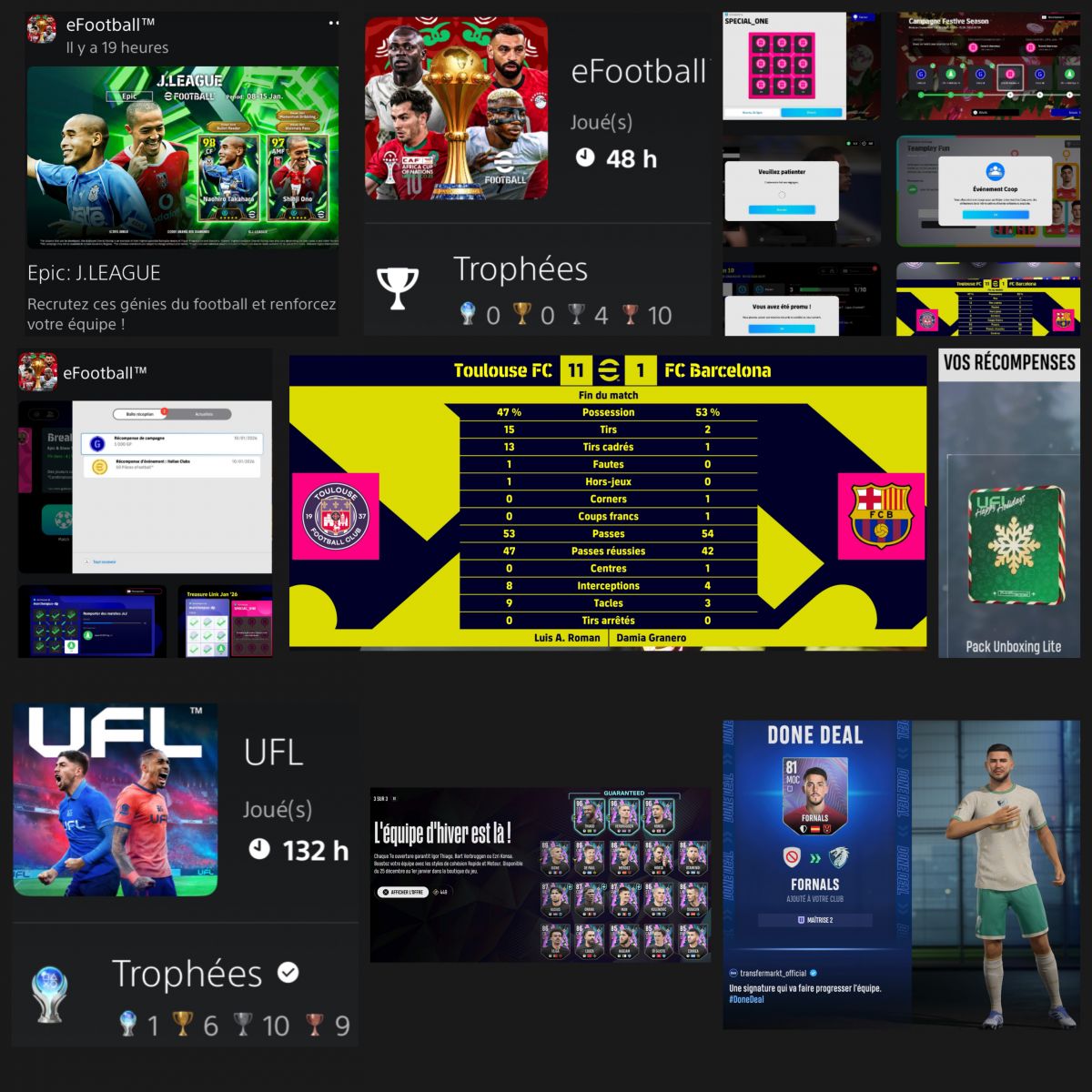 e - Footbal et UFC , mes jeux de Foot, scéances rapides , ufc déjà platiné et e football presque platinés, just for fun pas intensif mais déja 132 h sur UFC , 48 h sur e footbal, on voit bien que mon truc c’est plus la NBA car 492 heures sur NBA 2k26, et W2k26 seulement 20 heures