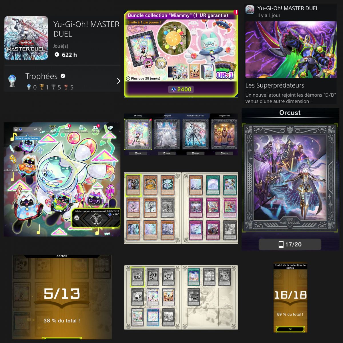 Yu Gi Ho 622 heures sur PS5 , ( plus avant cela sur PS4 ) , en un peu plus de deux ans, les albums collector de Bundles ne vont pas me décourrager mon interêt augmente même si je limite un peu mon temps de jeu dessus, deux fois d’affilé ou je vais atteindre niveau max du battlepass depuis les albums car pour avoir les bundles à albums faut gagner les 3000 ou 2400 donc jouer