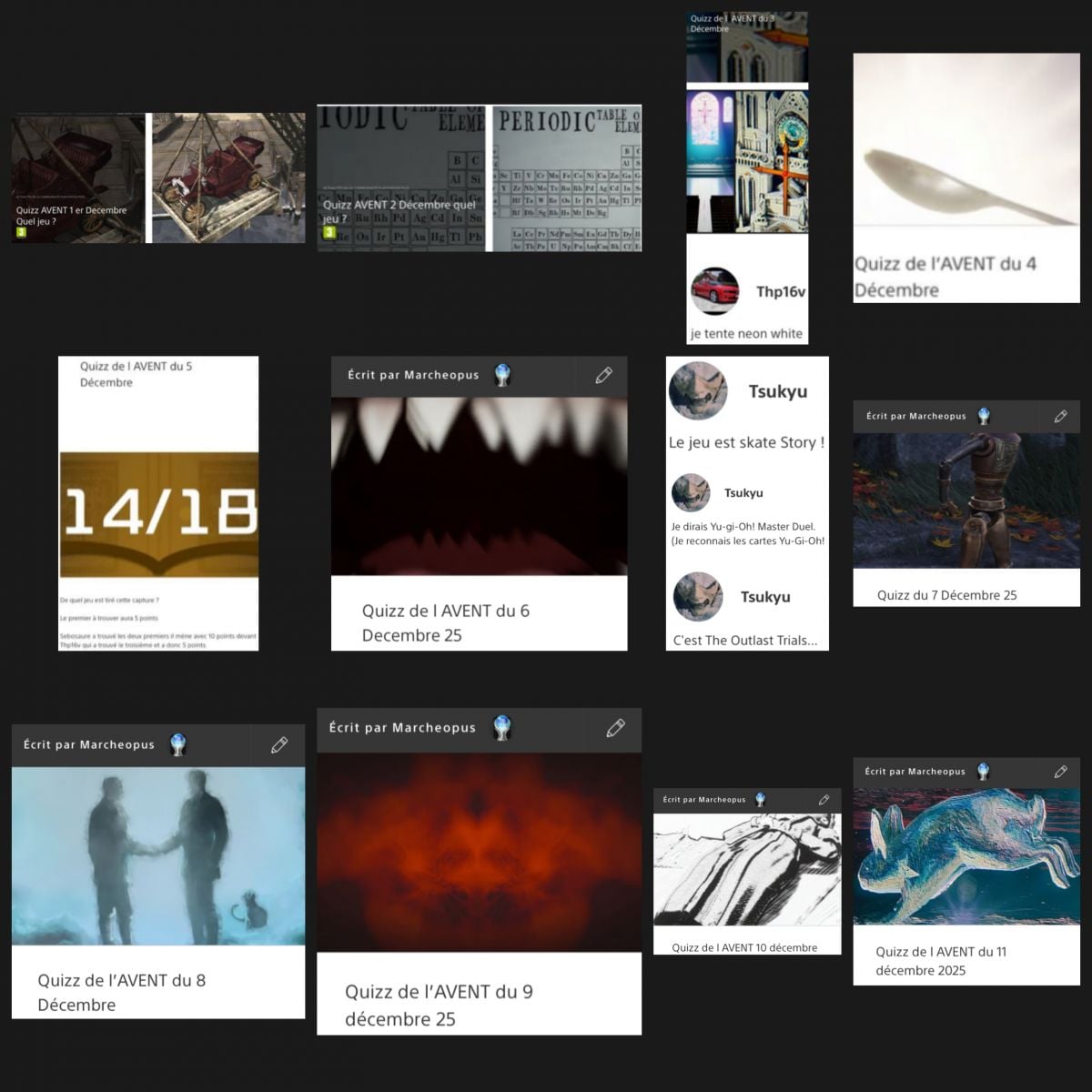 Et tous les jours mon quizz de l’avent certains n’ont pas étés trouvés il est possible de remonter sebosaure, Tsuyui et thp16v Mokito de la Vega en tête avec 20, 20 points les deux premiers ex aequo 5 et 5 points