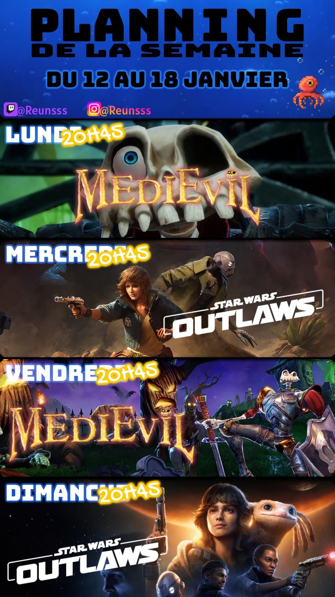 Cette semaine je vous invite à me rejoindre pour prolonger l'aventure de 2 jeux : Star Wars Outlaws et MediEvil (le très chouette remake). Les détails sur le planning juste en-dessous.