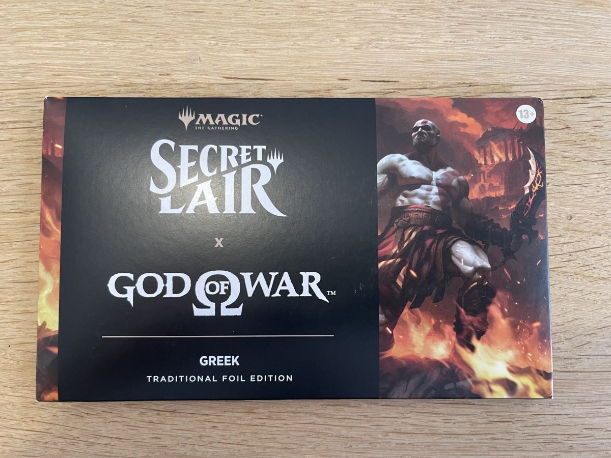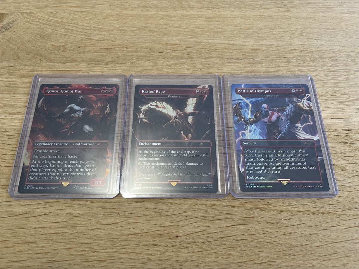 Je vous parle de tout ça parce que j’ai reçu ma commande ce matin. Une série se présente sous la forme d’un packaging format enveloppe. C’était ma première commande Secret Lair, et je m’attendais à autre chose. Un ami m’avait montré sa série Secret Lair x Stranger Things et la boîte était nettement plus jolie, plus travaillée. Wizards of the Coast a probablement modifié son schéma industriel entre les deux éditions et je suis passé à côté de l’information. Tant pis ! J’ai retenu ces 3 artworks de la série God of War, que je trouve vraiment sublimes. Ma préférence va clairement à la carte Kratos, God of War (et ma photo ne lui fait clairement pas honneur !).