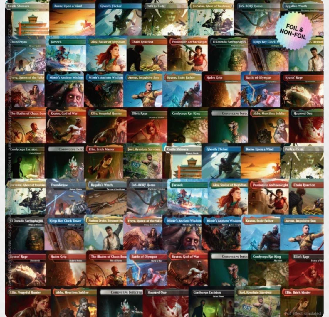 Dans le cadre de cette collaboration avec Playstation, des jeux emblématiques de la console étaient mis à l’honneur : The Last of Us Part I & II, God of War, God of War Ragnarok, Horizon, Uncharted et Ghost of Tsushima. Un total de 7 séries de 5 cartes, chaque série disponible en standard ou en foil (comprendre « brillante », une sorte de rendu premium connu des passionnés de ce type de produits). Étant donné qu’il s’agit d’éditions limitées premium, le prix l’était malheureusement tout autant : 45€ pour une série standard, 55€ pour une série foil. Je vous laisse faire vos petits calculs, mais il fallait sortir un petit billet pour le fullset. Ce budget correspondant presque à mon budget gaming annuel, j’ai regardé tous les cartes en détails pour sélectionner celles qui me plaisaient le plus. Bien que j’ai été joueur et arbitre MTG en compétition au niveau national il y a une bonne quinzaine d’années, mon attrait était exclusivement sur les artworks des cartes. Je vous livre donc ici mon avis.
